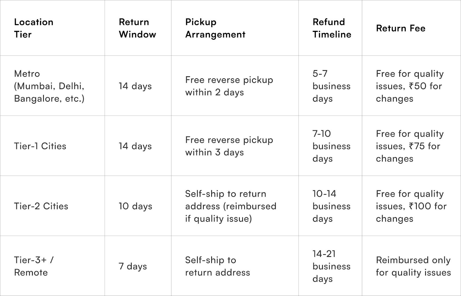 Remote pin codes where reverse pickup costs ₹150-200 make free returns unsustainable. The solution isn't a uniform restrictive policy—it's transparent geographic variation based on customer location.